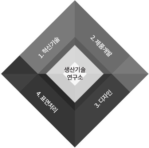 革新技術、製品開発、表面処理、デザインなど4つの専門分野別に研究専門チームが構成され、各分野の研究開発に注力しており、研究結果を関連部署及び生産現場に応用しています。